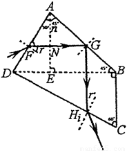 试题分析:(1)设光在AD面的入射角、折射角分别为i、r , r=30°