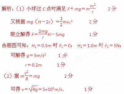 (2013浙江省舟山市期末联考)在半径R=5000km的某星球表面,宇航员做了如下实验,实验装置如图甲所示。竖直平面内的光滑轨道由轨道AB和圆弧轨道BC组成,将质量m=0.2kg的小球,从轨道AB上高H处的某点静止滑下,用压力传感器测出小球经过C点时对轨道的压力F,改变H的大小,可测出相应的F大小,F随H的变化关系如图乙所示(横坐标每小格长度表示0.1m)。求: