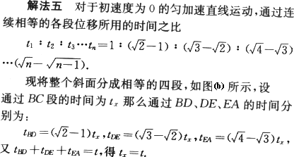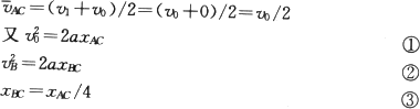 分析:由于物体的末速度为零,因此可以根据匀变速直线运动的特殊规律和推论解决该题. 解法一 逆向思维法 物体向上匀减速冲上斜面,相当于向下匀加速滑下斜面. 故xBC=at xAC=a(t+tBC)2/2 又xBC=xAC/4 解得:tBC=t 解法二 比例法 对于初速度为零的匀变速直线运动,在连续相等的时间里通过的位移之比为 x1∶x2∶x3…∶xn=1∶3∶5…(2n-1) 现有xBC∶XBA=XAC/4∶3xAC/4=1∶3 通过xAB的时间为t,故通过xBC的时间tBC=t. 解法三 中间时刻速度法 利用教材中的推论:中间时刻的瞬时速度等于这段位移的平均速度. 解①②③得:vBC=v0/2. 可以看出vB正好等于AC段的平均速度,因此B点是中间时刻的位移.因此有tBC=t. 解法四 图象法 利用相似三角形面积之比,等于对应边平方比的方法,作出v-t图象,如图(a)所示.
