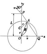 | 首先,根据题意可知,原点O处是有磁场的,粒子由此出发,初速沿x轴正方向,粒子在磁场中洛仑兹力作用下应当做匀速圆周运动,且其圆心必在y轴上.如果P处也在磁场范围内,则粒子到此处必定是经历了半个周期(半圆),这样到此处时的速度必与外轴垂直.即沿x轴负方向.可是现在已知在P点时粒子的速度与y轴正方向成30°角,由此可知粒子在到达P点之前就已经离开磁场.也就是说,圆形磁场区的半径必小于OP间的距离.