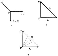 选节点O为研究对象,O点的受力情况如图a所示:重物对O点的拉力F(F=G),绳OA、OB的拉力TA、TB,这三个力合力为零.根据平衡方法可以做出F的平衡力F′, F′、TA和TB组成的矢量三角形如图b所示:在B点逐渐上移的过程中,拉力TB的方向改变,拉力TA的方向不变,F′的大小和方向均不变,利用矢量三角形动态分析的方法可以直接判断出TA、TB大小变化的情况. 由图c可以看出:在OB绳向OC靠近的过程中,TA一直在逐渐减小,而TB却是先变小后增大,当OB与OA垂直时,TB最小.