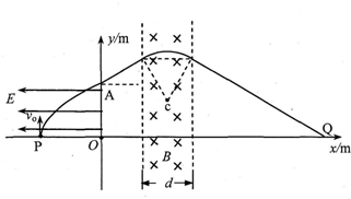 9.如图所示,直角坐标系xOy位于竖直平面内,在x≤0的区域内有沿x轴负方向的匀强电场,在x>0的区域内有一方向垂直纸面向里、磁感应强度大小B=4.0×10-2T、宽度d=2m,边界垂直于x轴,位置待定的匀强磁场.一比荷为5.0×107C/kg的负粒子从P(-3,0)点以速度V0=2×106m/s沿y轴正方向射入电场,从y轴上的A(0,2$\sqrt{3}$)点射出匀强电场区域,再经匀强磁场偏转最终通过x轴上的Q(9,0)点(图中未标出),不计粒子重力.求:(1)匀强电场的电场强度E: