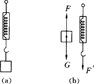 解析:如图(a)所示,重物挂在弹簧秤上,重物受两个力:物体的重力G(即重量),弹簧挂钩对物体的拉力F,如图(b)所示.由于物体处于静止状态,故F与G应是一对平衡力,大小相等,即F=G. ① 又因为弹簧秤对物体有作用力F的同时,物体对弹簧秤也有反作用力 由①②两式可得: 即弹簧秤所受拉力的大小与物体的重量相等,所以弹簧秤的示数可表示物体的重力. |