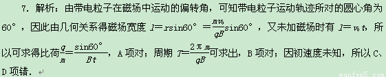如图所示,在一矩形区域内,不加磁场时,不计重力的带电粒子以某初速度垂直左边界射入,穿过此区域的时间为t.若加上磁感应强度为B、垂直纸面向外的匀强磁场,带电粒子仍以原来的初速度入射,粒子飞出磁场时偏离原方向60°,利用以上数据可求出下列物理量中的 ( )