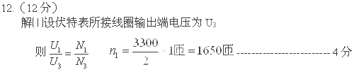 如图所示,理想变压器原线圈中输入电压U1=3300V,副线圈两端电压U2为220V,输出端连有完全相同的两个灯泡L1和L2,绕过铁芯的导线所接的电压表V的示数U=2V,求:![]()