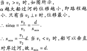 如图所示,一条河的水流速度为v1,一小船在静水中的划行速度为v2,若这船在该河中航行,要使船从一岸到另一岸的路程最短,最短路程用xmin表示,则