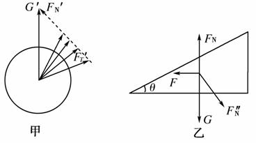 解析: 利用矢量三角形法对球体进行分析如图甲所示,可知F′T是先减小后增大,根据牛顿第三定律,FT先减小后增大.斜面对球的支持力F′N逐渐增大.对斜面受力分析如图乙所示,可知F=F″Nsin θ;因为F″N=F′N(作用力反作用力),F′N逐渐增大,所以F″N逐渐增大,F逐渐增大,水平面对斜面的支持力FN=G+F″N·cos θ,故FN逐渐增大.