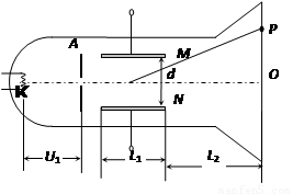 ÈçͼËùÊ¾ÎªÒ»Õæ¿Õʾ²¨¹Ü£¬µç×Ó´ÓµÆË¿K·¢³ö£¨³õËٶȲ»¼Æ£©£¬¾µÆË¿ÓëA°å¼äµÄ¼ÓËÙµçѹU1¼ÓËÙ£¬´ÓA°åÖÐÐÄ¿×ÑØÖÐÐÄÏßKOÉä³ö£¬È»ºó½øÈëÁ½¿éƽÐнðÊô°åM¡¢NÐÎ³ÉµÄÆ«×ªµç³¡ÖУ¨Æ«×ªµç³¡¿ÉÊÓΪÔÈÇ¿µç³¡£©£¬µç×Ó½øÈëM¡¢N¼äµç³¡Ê±µÄËÙ¶ÈÓëµç³¡·½Ïò´¹Ö±£¬µç×Ó¾¹ýµç³¡ºó´òÔÚÓ«¹âÆÁÉϵÄPµã¡£ÒÑÖª¼ÓËÙµçѹΪU1£¬M¡¢NÁ½°å¼äµÄµçѹΪU2£¬Á½°å¼äµÄ¾àÀëΪd£¬°å³¤ÎªL1£¬°åÓҶ˵½Ó«¹âÆÁµÄ¾àÀëΪL2£¬µç×ÓµÄÖÊÁ¿Îªm£¬µçºÉÁ¿Îªe¡£Çó£º