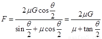 如图所示,两个完全相同的球A、B,重力大小均为G,两球与水平地面间的动摩擦因数均为µ,一根轻绳两端固定在两球上,在绳的中点施加一个竖直向上的拉力F,当绳被拉直后,两段绳间的夹角为α,问当F至少为多大时,两球将会发生滑动?