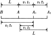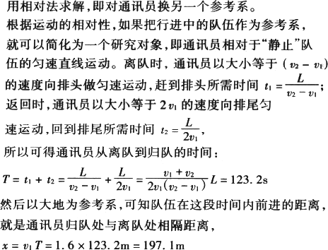 解法一:(1)通讯员从排尾赶到排头时,有关系式: v2t1-v1t1=L 设通讯员从排头返回排尾的速度为 v1t2+ 联立以上两式,得通讯员从离开队伍到重新返回排尾共需时间: 解法二: 思路与启迪:本题有两个研究对象:通讯员和行进中的队伍,两者都做匀速直线运动,其运动示意图如图所示.设队伍原位置为AB,通讯员从排尾赶到排头时,排头已到位置A1,所用时间为t1,通讯员返回排尾时,排头的位置为A2,所用时间为t2在时间t1内,通讯员与队伍位移之差等于队伍长L;在时间t2内,通讯员与队伍位移大小之和等于L.