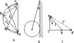 小结:物理问题中有一些变化过程,不是单调变化的.在平衡问题中可算是一类问题,这类问题应抓住研究变量与不变量的关系.可从受力分析入手,列平衡方程找关系,也可以利用图解,用矢量三角形法则解决问题.如此题物体在未滑动时,处于平衡状态,加速度为零.所受三个力围成一闭合三角形.如图A.类似问题如图B用绳将球挂在光滑的墙面上,绳子变短时,绳的拉力和球对墙的压力将如何变化.从对应的矢量三角形图C不难看出,当绳子变短时,