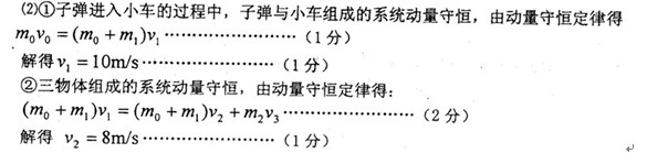 如图所示,一质量m1=0.45kg的平板小车静止在光滑的水平轨道上,车顶右端放一质量m2=0.2kg的小物体,小物体可视为质点,现有一质量m0= 0.05kg的子弹以水平速度v0=l00m/s射中小车左端,并留在车中,最终小物块以5m/s的速度与小车脱离,子弹与车相互作用时间很短,g取l0m/s2.求:
