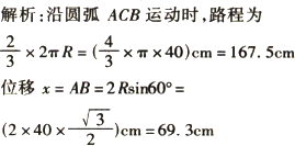 如图所示,某物体沿半径为40 cm的圆轨道运动,某时刻从A点出发,沿弧ACB经过一段时间到达B点(内接△ABC为等边三角形).求物体在这段时间里通过的路程与位移大小.