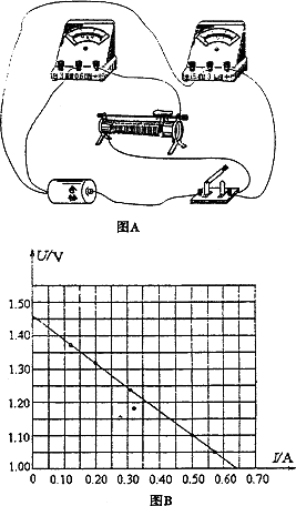 测量电源电动势和内电阻的器材如图A所示,请用实线表示导线,将图A中器材连成实验用电路,实验时经测量得出的数据如下表,请在下图B的方格纸上画出U-I图线.利用图线可求出电源电动势和内电阻分别为________、________.
