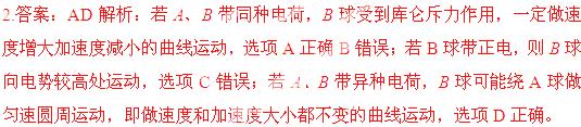 D.若A、B带异种电荷,B球可能做速度和加速度大小都不变的曲线运动