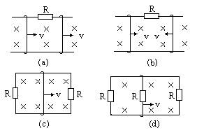 下图各情况中,电阻R=0.lΩ,运动导线的长度都为l=0.05M,作匀速运动的速度都为v=10M/s.除电阻R外,其余各部分电阻均不计.匀强磁场的磁感强度B=0.3T.试计算各情况中通过每个电阻R的电流大小和方向.![]()