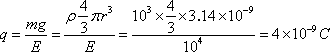 带电雨滴在电场力和重力最用下保持静止,根据平衡条件电场力和重力必然等大反向mg=Eq,则 |