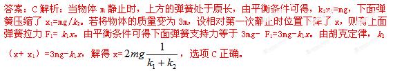 如图所示,两根轻弹簧AC和BD,它们的劲度系数分别为k1和k2,它们的C、D端分别固定在质量为m的物体上,A、B端分别固定在支架和正下方地面上,当物体m静止时,上方的弹簧处于原长;若将物体的质量变为3m,仍在弹簧的弹性限度内,当物体再次静止时,其相对第一次静止时位置下降了( )
