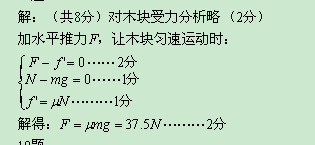 (8分)质量为5kg的木块放在水平木板上,木块与木板间的动摩擦因数为0.75,要使木块能沿木板匀速滑动,需给木块施加水平力为F,请画出木块在木板上匀速运动时的受力分析图,并求出力F的大小是多少?(g=10m/s2)