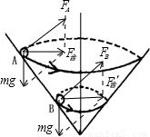 如图所示,倒置的光滑圆锥面内侧,有质量相同的两个小玻璃球A、B,沿锥面在水平面内作匀速圆周运动,关于A、B两球的角速度、线速度和向心加速度正确的说法是( )A.它们的角速度相等ωA=ωB
