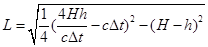 (9分)如图所示,一艘海轮用船上天线D向海岸边的信号接收器A发送电磁波脉冲信号。信号接收器和船上天线的海拔高度分别为AB=H和CD=h。船上天线某时刻发出一个电磁波脉冲信号,接收器接收到一个较强和一个较弱的脉冲,前者是直接到达的信号,后者是经海平面反射后再到达的信号,两个脉冲信号到达的时间间隔为△t,电磁波的传播速度为c,求船上天线发出此信号时海轮与海岸的距离L。