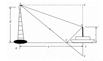 ,延长AE交DC的延长线与F,过A做AG平行于BC,交CD的延长线与G,则有DE=EF,GD=H-h,GF=H+h (2分),设信号接收器接收到沿直线DA和折线DEA传播的电磁脉冲信号需要的时间分别为t1和t2,则有