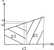 【答案】分析:匀加速直线运动,前一半时间位移较小,后一半时间位移较大,所以中间时刻的速度比位移中点的速度要小,此外,可以设出初速度、加速度和时间,利用数学方法整理v2,v3的表达式,较好的方法是作v-t图,由图象看两速度的大小关系