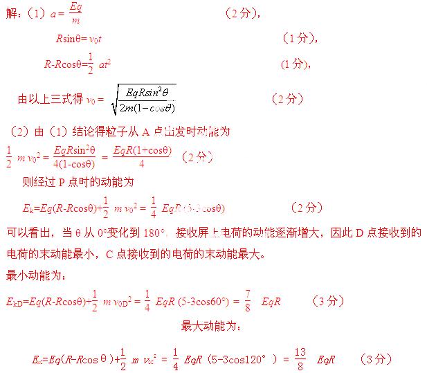 (2)若在圆形区域的边缘有一接收屏CBD,如图(乙)所示,C、D分别为接收屏上最边缘的两点,∠COB=∠BOD=30°.求该屏上接收到的电荷的最大动能和最小动能.