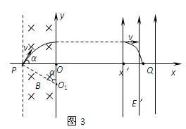 ⑶若只改变上述电场强度的大小,要求带电粒子仍能通过Q点,讨论此电场左边界的横坐标x′与电场强度的大小E′的函数关系。