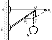思路分析:在支架的 O端悬挂电灯后,使支架的两根杆受到力的作用.由于支架的A、B两端与墙壁是铰链连结,因此作用在杆上的力是沿杆的方向.但杆受的是拉力还是压力,需要通过实践来判断.可以设想,若将杆AO换成弹簧,则弹簧会被拉长,表示此杆受的是拉力.若将杆BO换成弹簧,则弹簧会被压缩,说明此杆受的是压力.这就是灯对支架O端拉力的两个分力所产生的实际效果. |