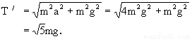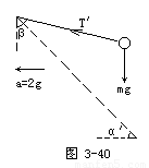 可见,当滑块以a=2g加速向左运动时,小球已脱离斜面飘起.此时小球仅受两个力作用:重力mg、线中拉力T′(图3-40).设线与竖直方向间夹角为β.同理由牛顿第二定律得