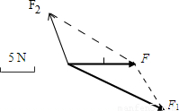 量出F2线段的长度约为1.7cm,由题图中以1cm长线段表示4N,则分力F2的大小=5N×1.7=7.5N