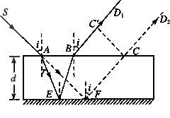 移去平玻璃板,该支光线SA直接射到平面镜,其反射光线为FD2,是与BD1光线平行的,它与玻璃板上表面所在平面交于C点,从图中得AC两点的距离 过C点作到BD,线的垂线,其垂足为C′.由平面几何知垂线CC′与上表面的夹角就等于入射角i,因此,BD与FD两支光线间的距离