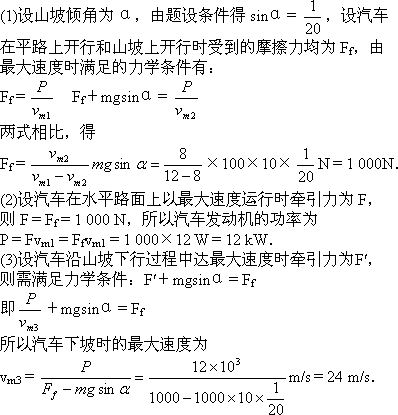 质量m=1 t的小汽车,以额定功率行驶在平直公路上的最大速度是vm1=12 m/s,开上每前进20 m升高1 m的山坡时最大速度是vm2=8 m/s.如果这两种情况中车所受到的摩擦力相等,求: