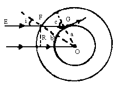 解:设入射光线EF为所求光束的临界光线,入射角为i, 经球壳外表面折射后折射角为r有 n= 因为EF为临界入射光线,所以该光线射向内表面的入射角正好等于临界角c,有sinC= 三角形OFG中,由正弦定理 解(1)、(2)、(3)得b= 根据对称性可知,所求光束的截面S应是一个圆,设圆半径R,∵入射光为平行光 ∴R=b·sini(5) 由(4)、(5)得 R=a S=πR2=πa2 |