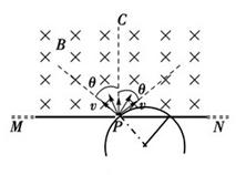 如图所示,在屏MN的上方有磁感应强度为B的匀强磁场,磁场方向垂直于纸面向里.P为屏上的一个小孔.PC与MN垂直.一群质量为m、带电荷量为-q的粒子(不计重力),以相同的速率v,从P处沿垂直于磁场的方向射入磁场区域.粒子入射方向在与磁场B垂直的平面内,且散开在与PC夹角为θ的范围内,则在屏MN上被粒子打中的区域的长度为( )
