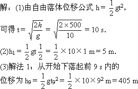 所以最后1 s内的位移为h10=h-h9=500 m-405 m=95 m. 解法2:将整个下落过程分成时间间隔相等的十段,则 h1∶h10=1∶(2×10-1) h10=19 h1=95 m. 深化升华:注意此处空半格根据题意,结合自由落体运动的初速度为零、加速度为g,选择合适的公式进行计算,是解决自由落体运动的基本方法.有时运用初速度为零的匀变速直线运动的有关比例式会使解题过程更简便. |