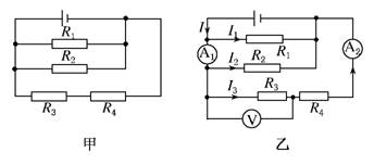 由图甲可以看出R3和R4串联后再和R1、R2并联接在电源两端.由图乙可以看出安培表A1示数为通过R2上的电流I2和通过R3上的电流I3之和;安培表A2量的是通过R3、R4上的电流(I3=I4);伏特表量的是R3两端的电压.