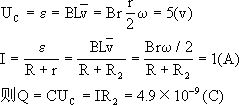 根据右手定则,感应电流的方向由O→A,但导体棒切割磁感线相当于电源,在电源内部电流从电势低处流向电势高处.故A点电势高于O点电势.又由于电容器上板与A点相接即为正极,同理电容器下板由于与O相接为负极. (2)电路中消耗的电功率P消=I2(R+R2)=5(W),或P消=Iε=5(W) |