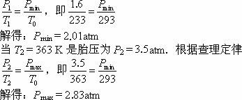 由于轮胎容积不变,轮胎内气体做等容变化. 设在 T0=293 K充气后的最小胎压为Pmin,最大胎压为Pmax.依题意,当T1=233 K时胎压为P1=1.6atm.根据查理定律 |