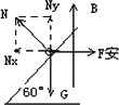 先将原图改画为侧视图,对导体棒受力分析,如图所示,导体棒恰好能静止,应有 Nx=F安,Ny=G 因为tan60°= 又F安=BIL 所以B= 导体棒对轨道的压力与轨道对棒的支持力N大小相等. N=