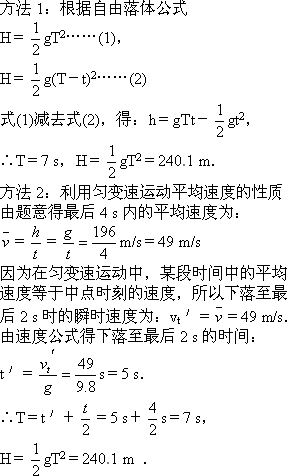 一个物体从H高处自由落下,经过最后196 m所用的时间是4 s,求物体下落H高所用的总时间T和高度H是多少?取g=9.8 m/s2,空气阻力不计.
