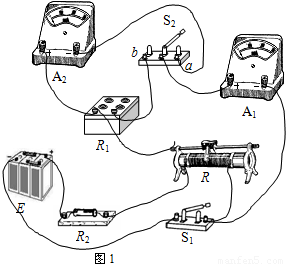 ②实验中该同学先合上开关S1,再将开关S2接a点,调节滑动变阻器R,当电流表A2示数合理时,记下电流表A1的示数I,然后将开关S2接b点,保持______不变,调节______,使电流表A1的示数也等于I时,读取电阻箱的示数.