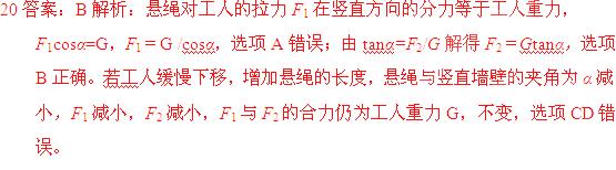 D.若工人缓慢下移,增加悬绳的长度,则F1减小,F2增大