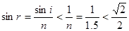 已知光在真空中的传播速度C=3×108m/s。如图,折射率n=1.5某玻璃立方体放在空气中。光线从立方体的顶面斜射进来,然后投射到它的另一个侧面P点,问: