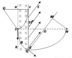 如图所示,真空室内存在宽度为d=8cm的匀强磁场区域,磁感应强度B=0.332T,磁场方向垂直于纸面向里;ab、cd足够长,cd为厚度不计的金箔,金箔右侧有一匀强电场区域,电场强度E=3.32×105N/C;方向与金箔成37°角.紧挨边界ab放一点状α粒子放射源S,可沿纸面向各个方向均匀放射初速率相同的α粒子,已知:α粒子的质量m=6.64×10-27kg,电荷量q =+3.2×10-19C,初速度v = 3.2×106m/s。不计粒子重力(sin37°= 0.6,cos37°= 0.8)求: