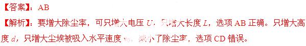 (2013北京西城期末)某同学设计了一种静电除尘装置,如图1所示,其中有一长为L、宽为b、高为d的矩形通道,其前、后面板为绝缘材料,上、下面板为金属材料。图2是装置的截面图,上、下两板与电压恒定为U的高压直流电源相连。带负电的尘埃被吸入矩形通道的水平速度为v0,当碰到下板后其所带电荷被中和,同时被收集。将被收集尘埃的数量与进入矩形通道尘埃的数量的比值,称为除尘率。不计尘埃的重力及尘埃之间的相互作用。要增大除尘率,则下列措施可行的是