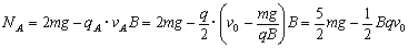 由动量守恒得:2mv0=2mvA+mvB, ① 由电荷守恒得:qA=qB= 碰后瞬间B对水平面恰无压力,则: mg=qBvBB, ③ 由①②③得,vB=2mg/qB,vA=v0- 对于A球碰后:NA+qAvAB=2mg, 故地面对A球的支持力: