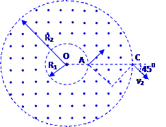 ⑵若撤去电场,如图(b),已知粒子从OA延长线与外圆的交点C以速度v2射出,方向与OA延长线成45°角,求磁感应强度的大小及粒子在磁场中运动的时间。