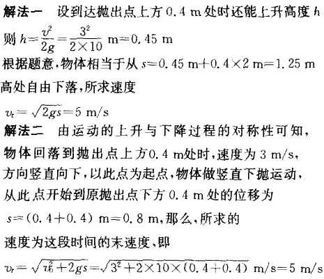 一个做竖直上抛运动的物体,当它经过抛出点上方0.4 m处时,速度是3 m/s,当它经过抛出点下方0.4 m处时,速度应为多少?(g取10 m/s2,不计空气阻力)